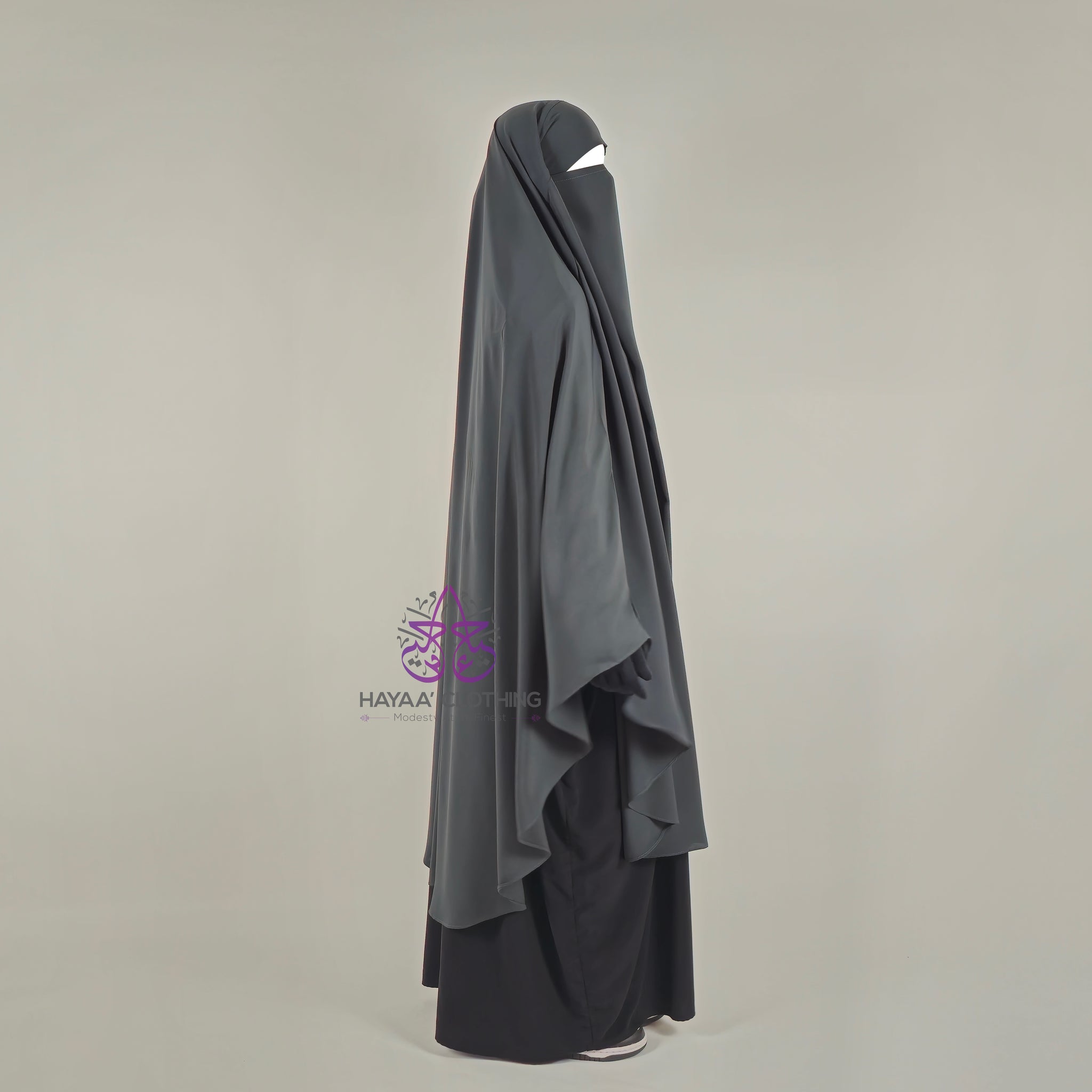 Introducing our long rounded Khimar. Crafted from a lightweight and breathable matte fabric, this Khimar offers exceptional modesty and comfort. Featuring a tie back headband and an integrated Niqab with smaller Niqab straps on the inside, allowing you to wear it with the Niqab or without. The length and width of this Khimar provides excellent coverage. It's rounded edge allows your hands to move freely without compromising on modesty.